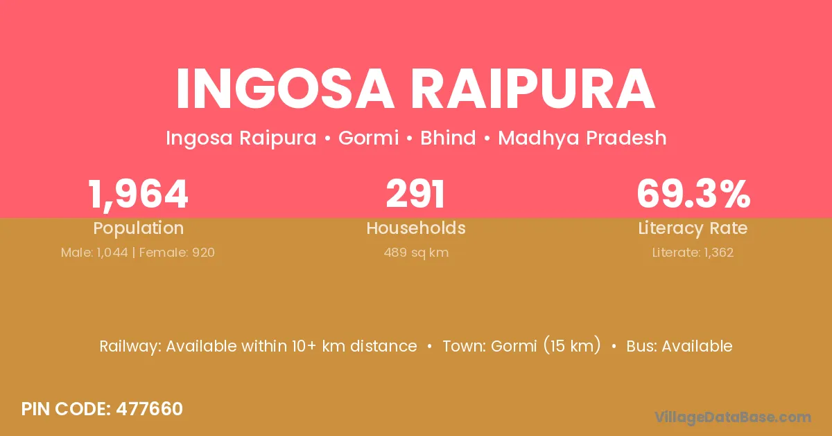 Gormi (15 km) is the nearest town to Ingosa Raipura village for major economic activities and is located approximately 15 km away.