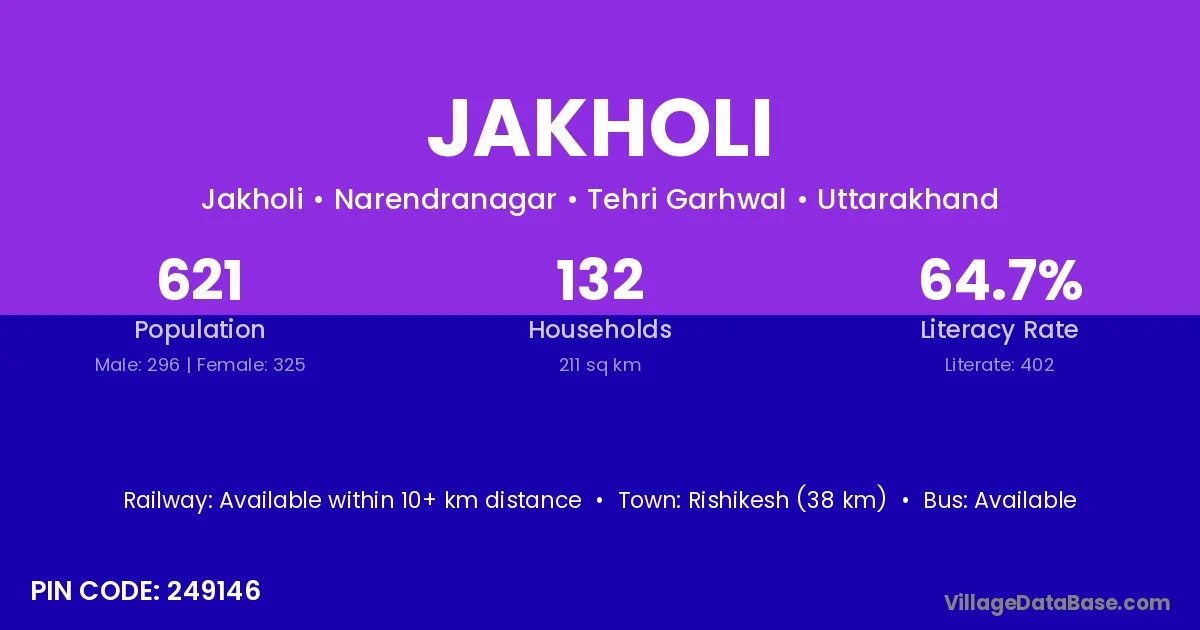 The literacy rate of Jakholi village is 50.17%. Male literacy stands at 62.78% and female literacy at 35.42%.