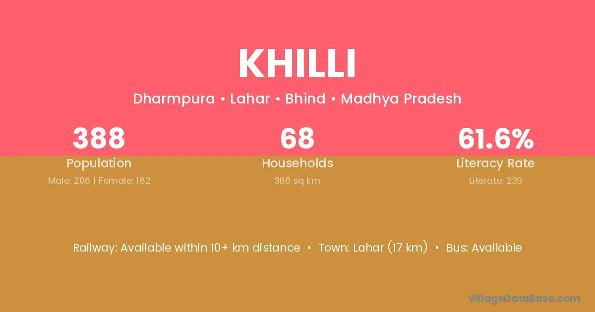 Lahar (17 km) is the nearest town to Khilli village for major economic activities and is located approximately 17 km away.