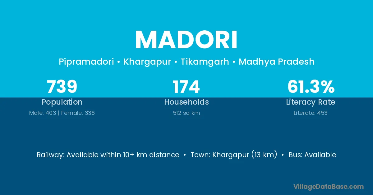 Lahar (18 km) is the nearest town to Madori village for major economic activities and is located approximately 18 km away.