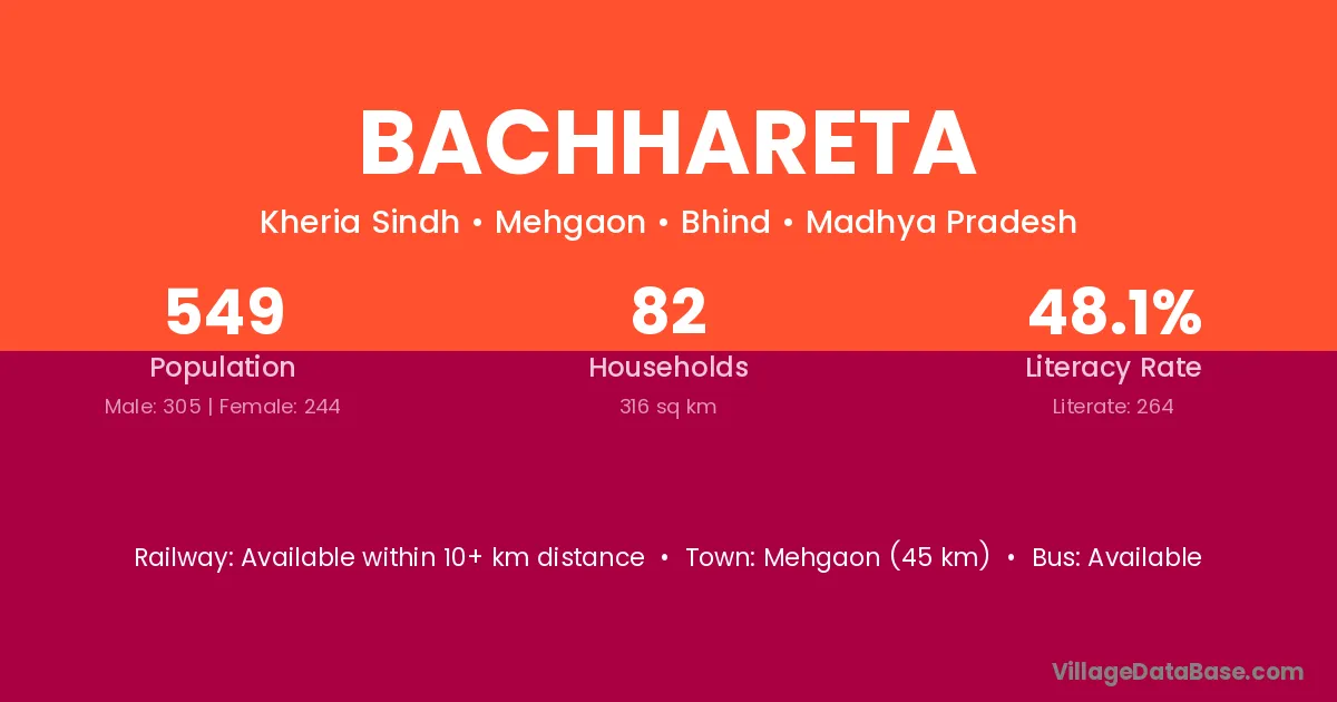 Mehgaon (45 km) is the nearest town to Bachhareta village for major economic activities and is located approximately 45 km away.