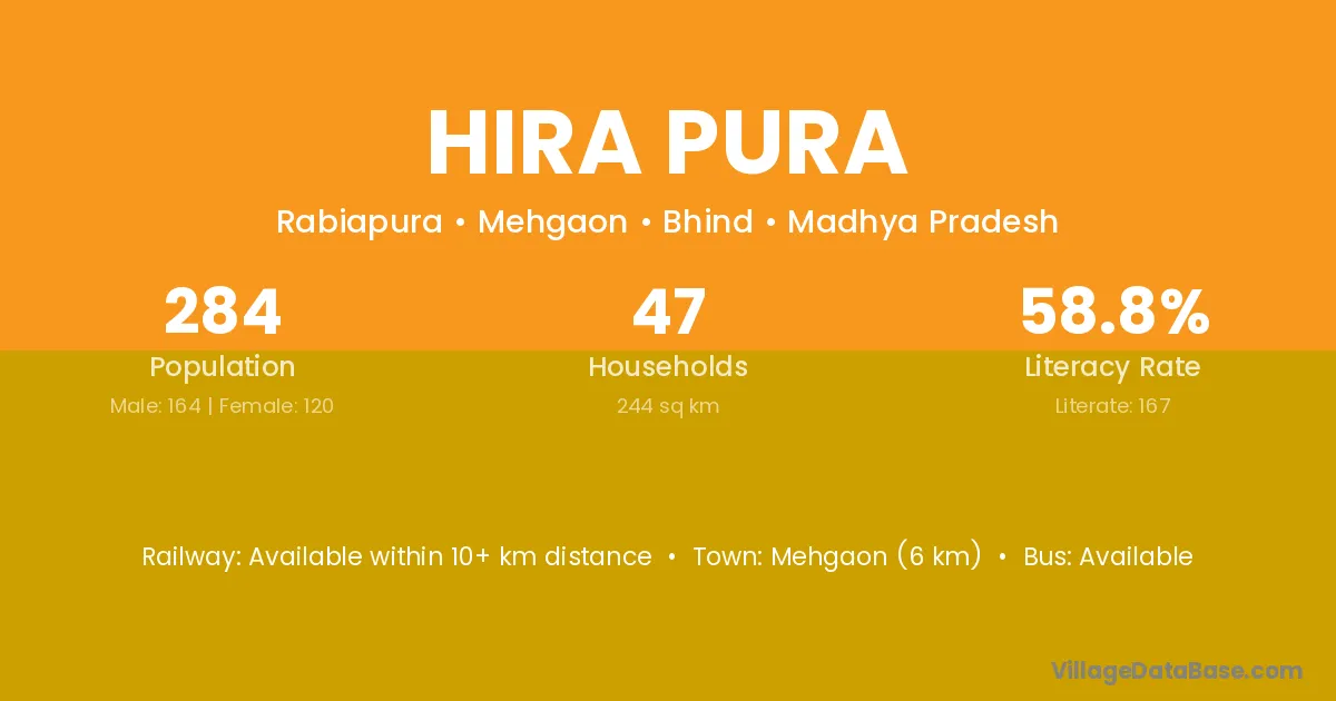 Mehgaon (6 km) is the nearest town to Hira Pura village for major economic activities and is located approximately 6 km away.