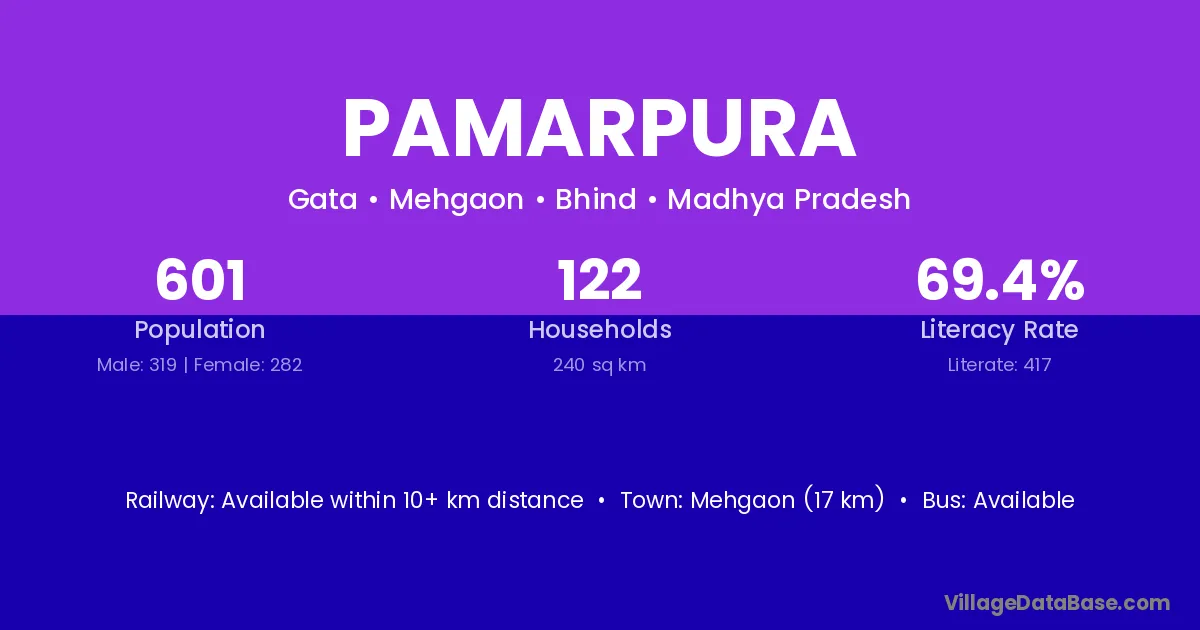 Mehgaon (17 km) is the nearest town to Pamarpura village for major economic activities and is located approximately 17 km away.