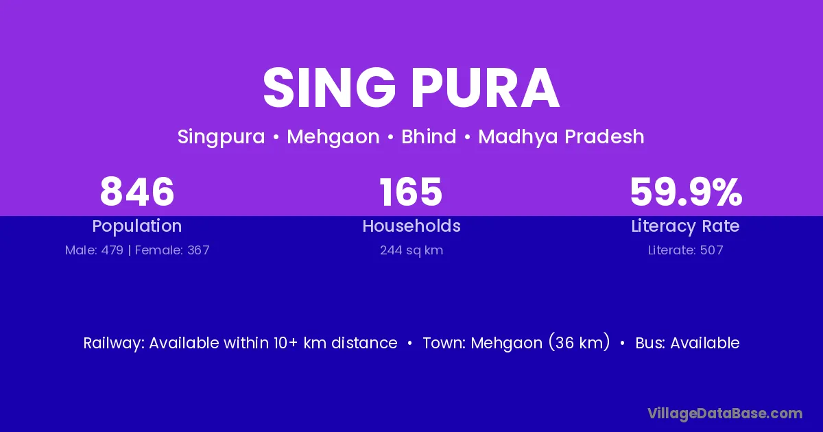 Mehgaon (36 km) is the nearest town to Sing Pura village for major economic activities and is located approximately 36 km away.