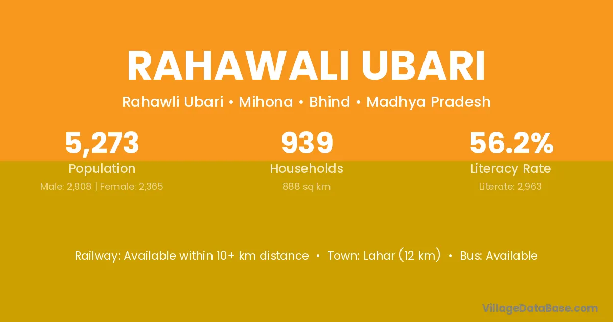 Lahar (12 km) is the nearest town to Rahawali Ubari village for major economic activities and is located approximately 12 km away.