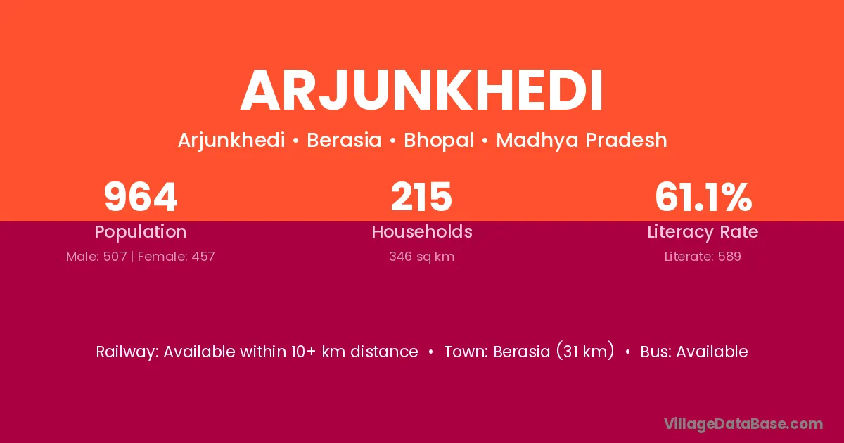 Berasia (31 km) is the nearest town to Arjunkhedi village for major economic activities and is located approximately 31 km away.