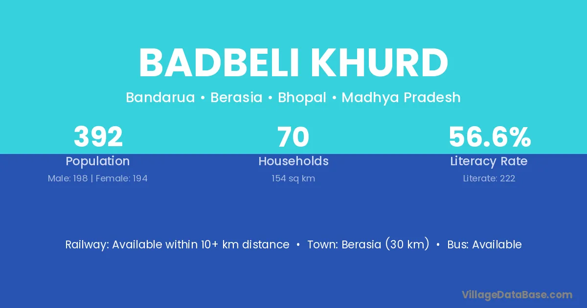 Berasia (30 km) is the nearest town to Badbeli Khurd village for major economic activities and is located approximately 30 km away.
