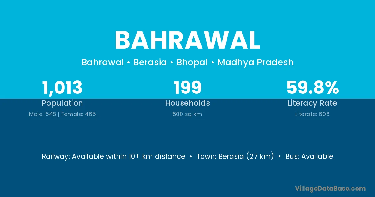 Berasia (27 km) is the nearest town to Bahrawal village for major economic activities and is located approximately 27 km away.