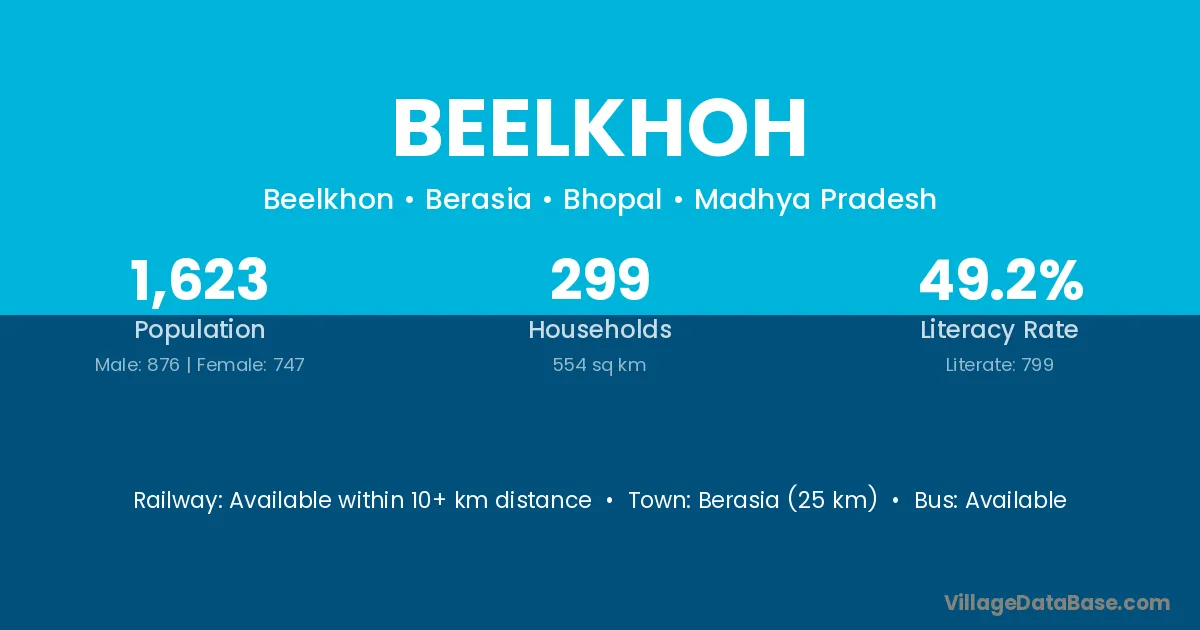 Berasia (25 km) is the nearest town to Beelkhoh village for major economic activities and is located approximately 25 km away.