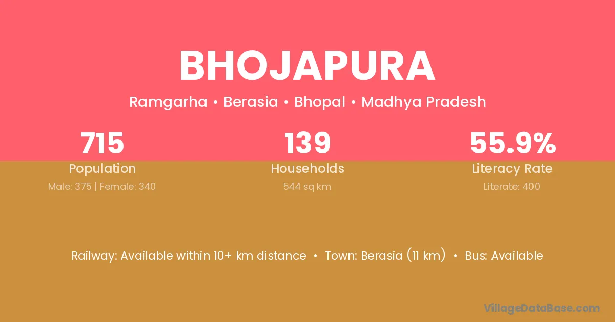 Berasia (11 km) is the nearest town to Bhojapura village for major economic activities and is located approximately 11 km away.