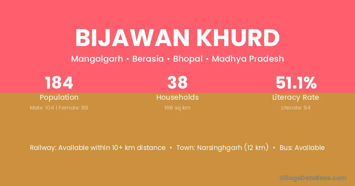 Narsinghgarh (12 km) is the nearest town to Bijawan Khurd village for major economic activities and is located approximately 12 km away.