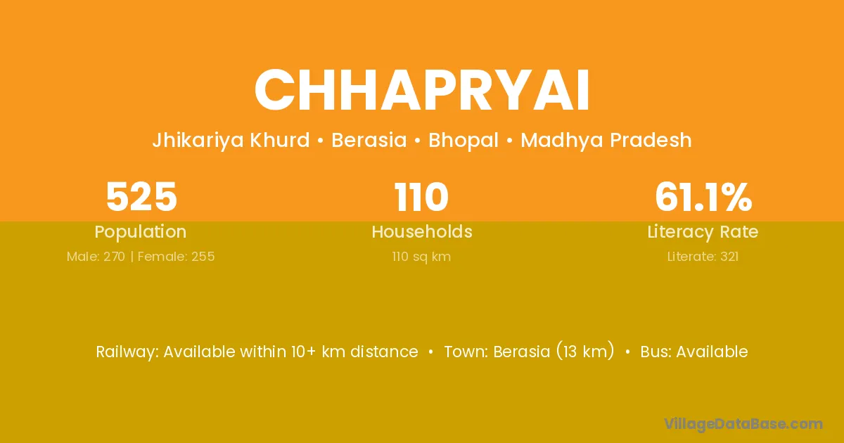 Berasia (13 km) is the nearest town to Chhapryai village for major economic activities and is located approximately 13 km away.