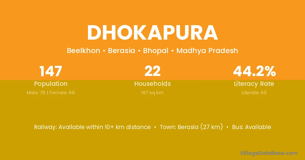 Berasia (27 km) is the nearest town to Dhokapura village for major economic activities and is located approximately 27 km away.