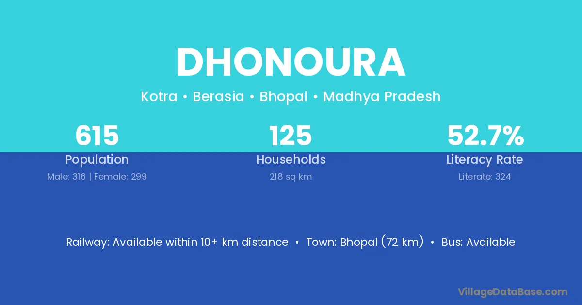 Bhopal (72 km) is the nearest town to Dhonoura village for major economic activities and is located approximately 72 km away.