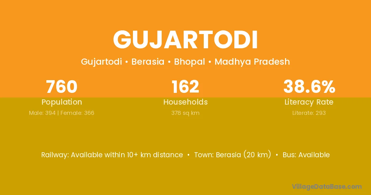 Berasia (20 km) is the nearest town to Gujartodi village for major economic activities and is located approximately 20 km away.
