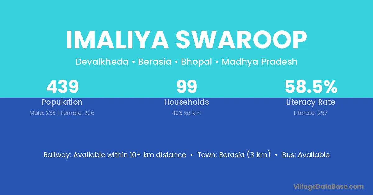 Berasia (3 km) is the nearest town to Imaliya Swaroop village for major economic activities and is located approximately 3 km away.
