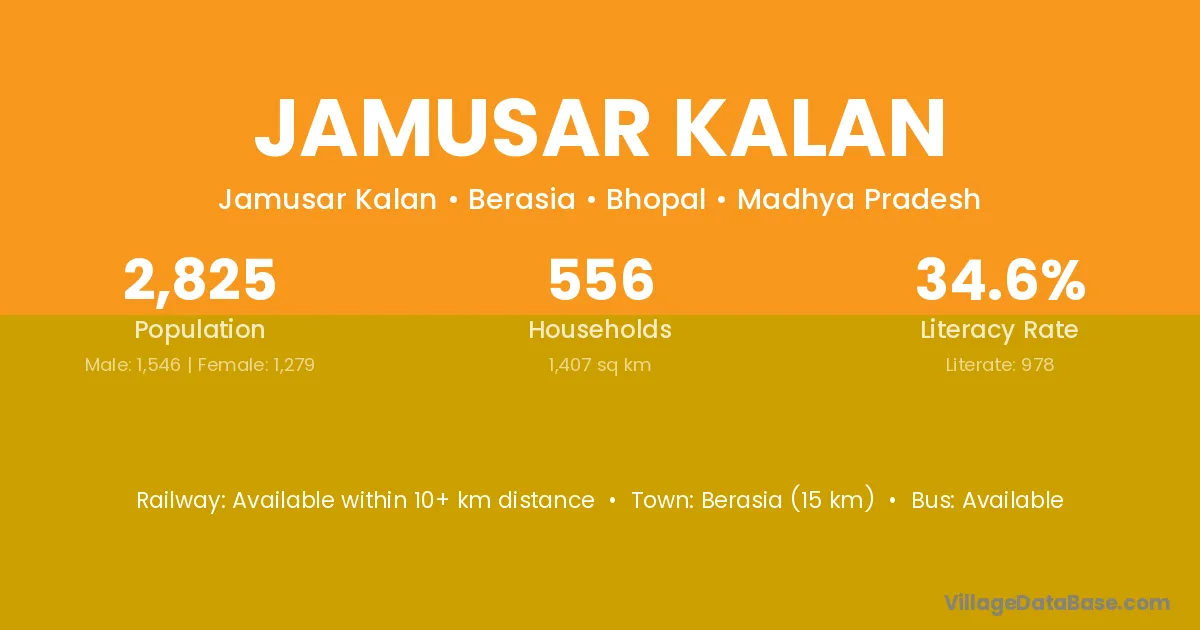 Berasia (15 km) is the nearest town to Jamusar Kalan village for major economic activities and is located approximately 15 km away.