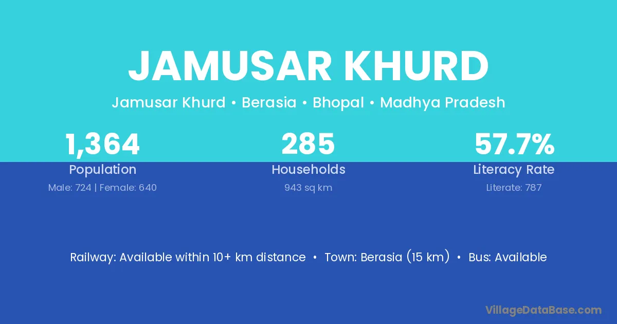 Berasia (15 km) is the nearest town to Jamusar Khurd village for major economic activities and is located approximately 15 km away.