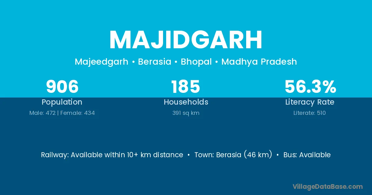 Berasia (46 km) is the nearest town to Majidgarh village for major economic activities and is located approximately 46 km away.