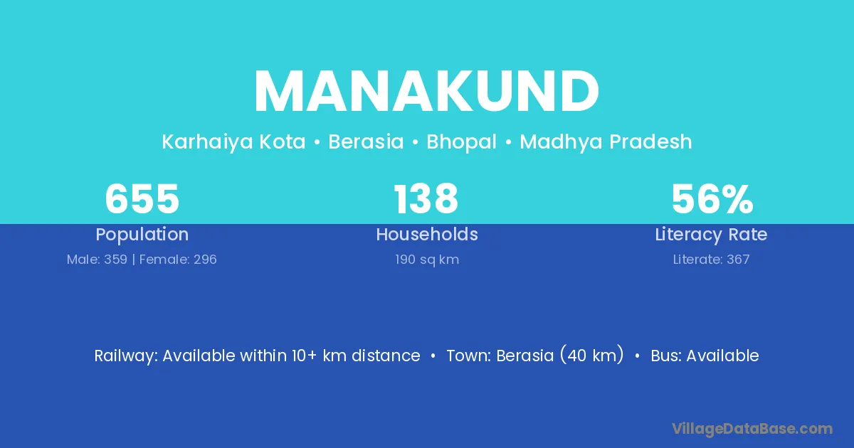 Berasia (40 km) is the nearest town to Manakund village for major economic activities and is located approximately 40 km away.