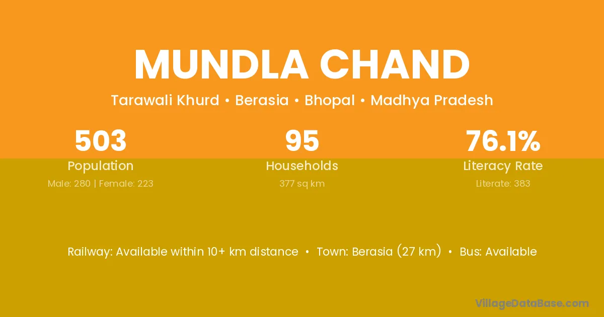 Berasia (27 km) is the nearest town to Mundla Chand village for major economic activities and is located approximately 27 km away.