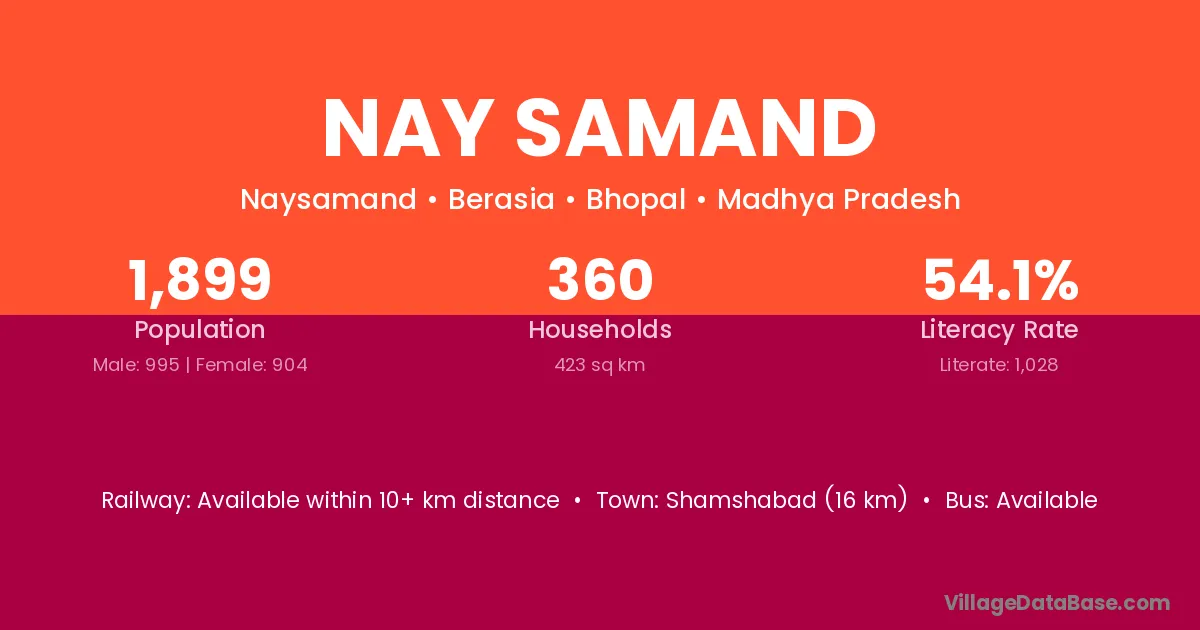 Nay Samand village has a total population of 1,899 people, of which 995 are males and 904 are females.