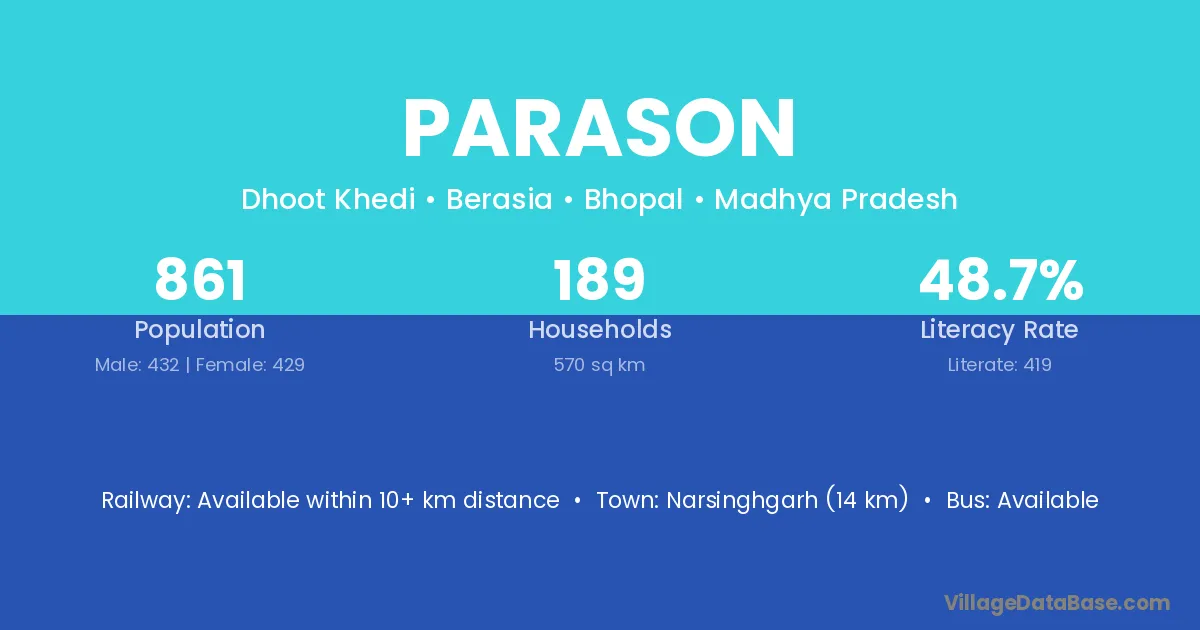 Narsinghgarh (14 km) is the nearest town to Parason village for major economic activities and is located approximately 14 km away.