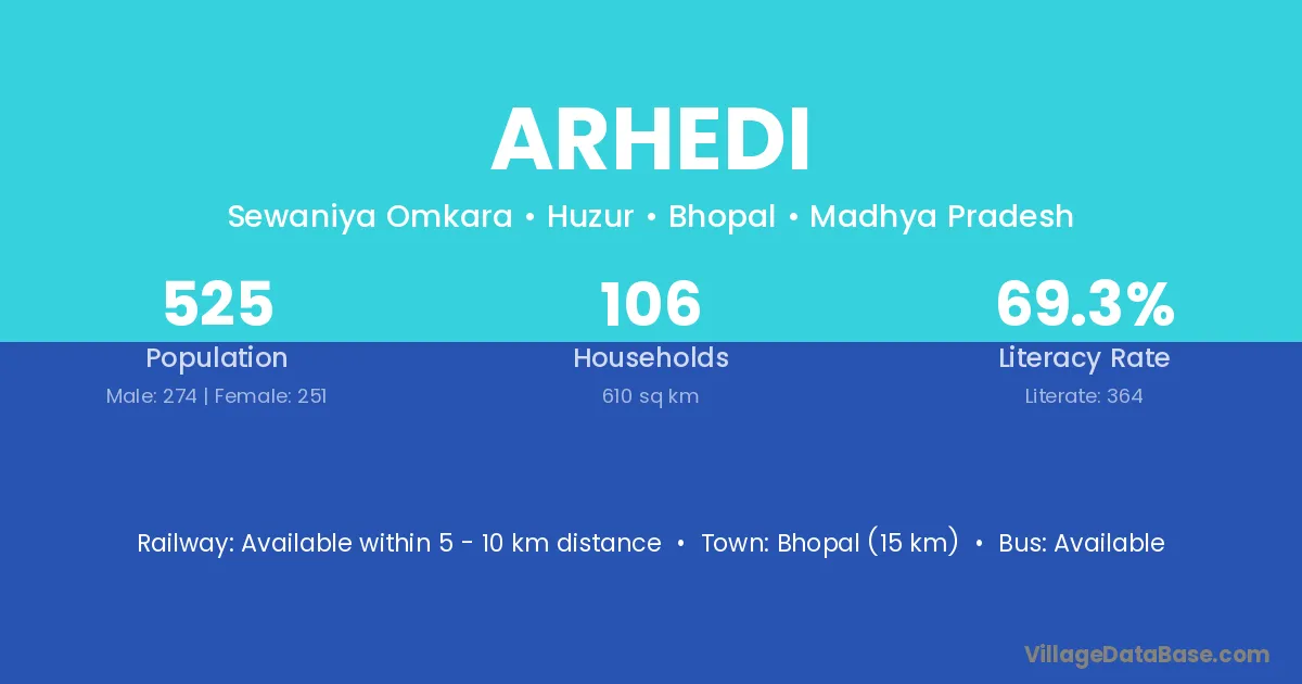 Bhopal (15 km) is the nearest town to Arhedi village for major economic activities and is located approximately 15 km away.