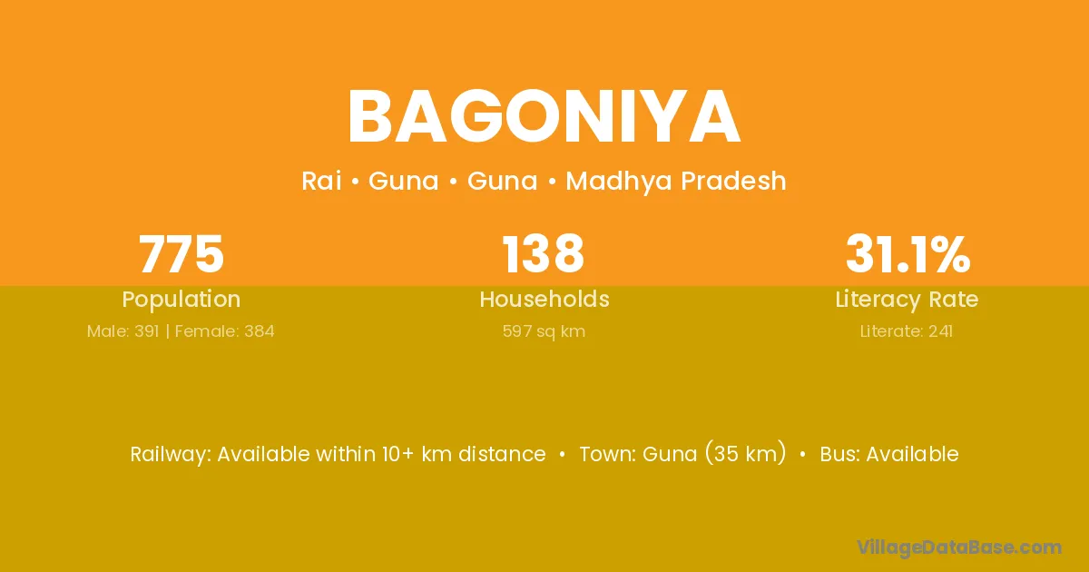 Bhopal (25 km) is the nearest town to Bagoniya village for major economic activities and is located approximately 25 km away.
