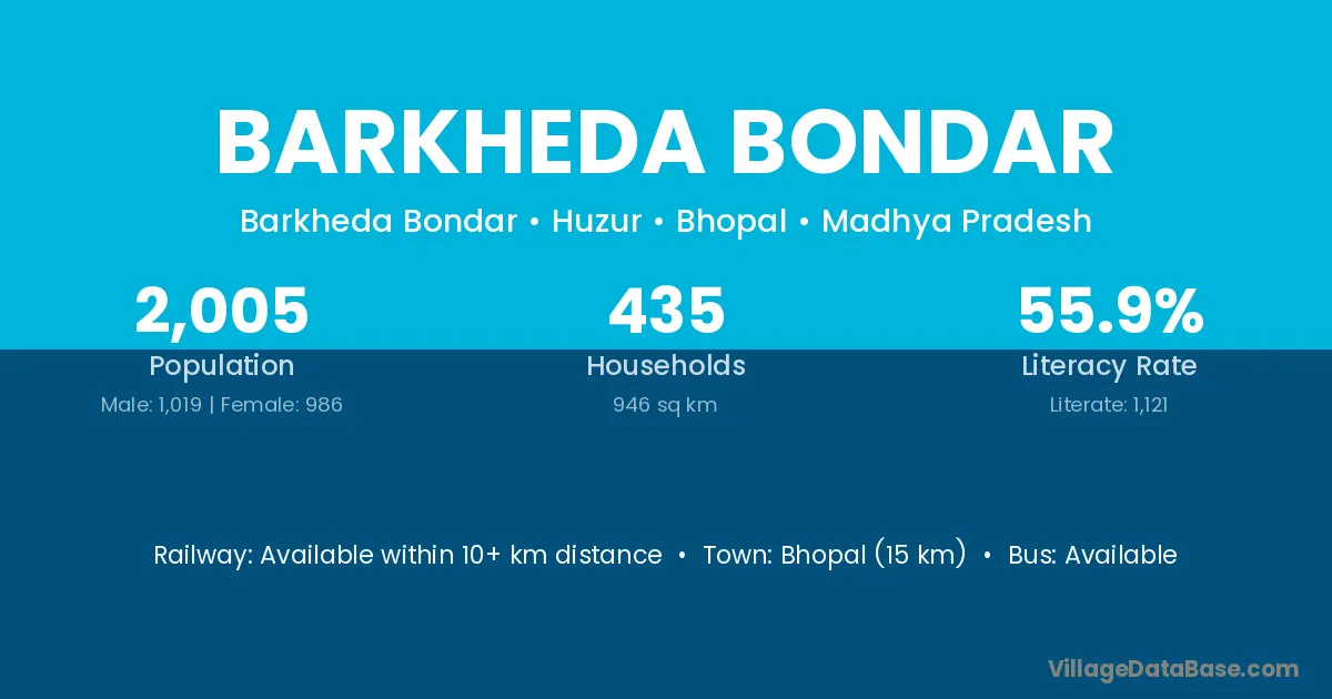 Bhopal (15 km) is the nearest town to Barkheda Bondar village for major economic activities and is located approximately 15 km away.