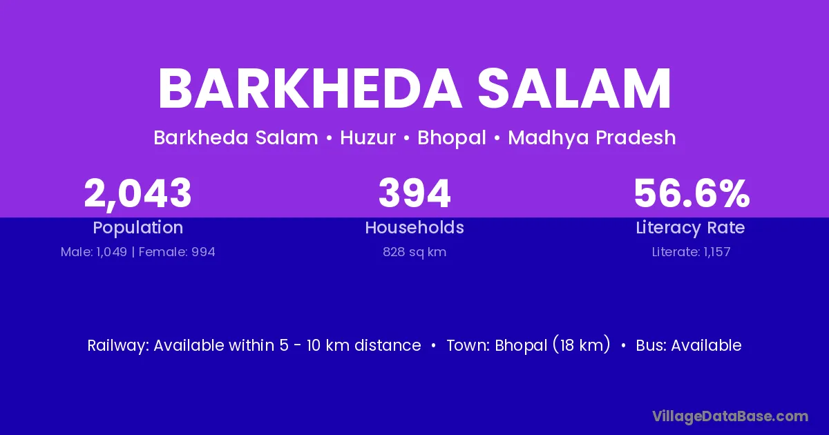 Barkheda Salam village has a total population of 2,043 people, of which 1,049 are males and 994 are females.
