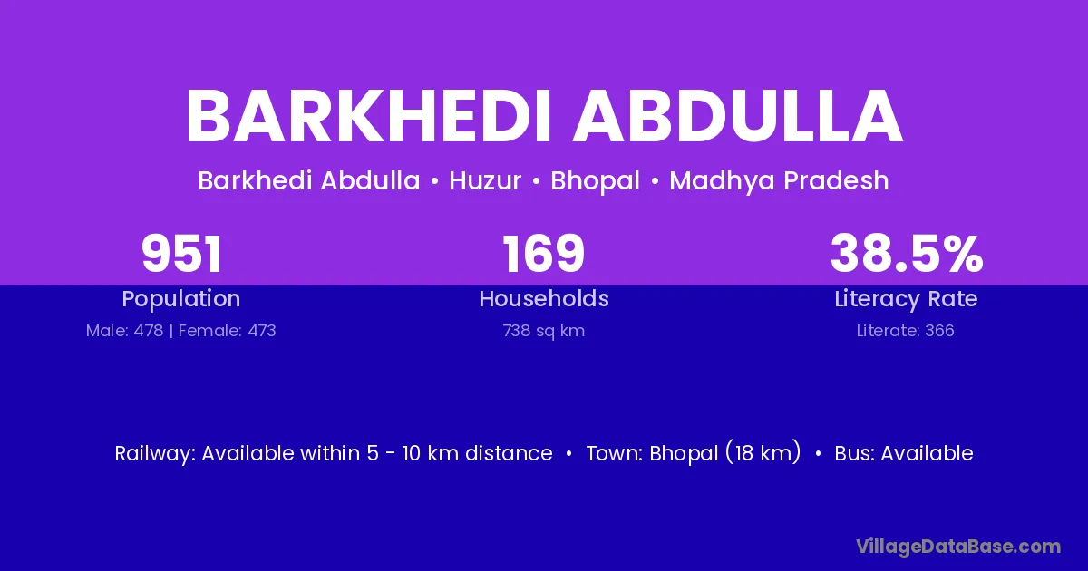 Barkhedi Abdulla village has a total population of 951 people, of which 478 are males and 473 are females.
