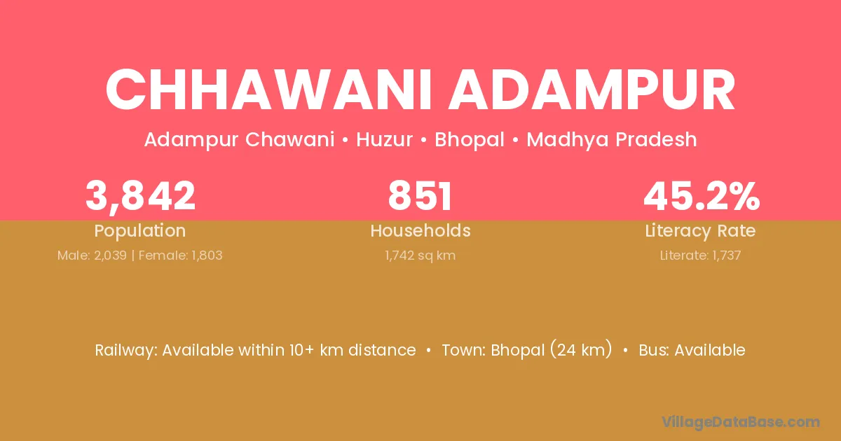 Bhopal (24 km) is the nearest town to Chhawani Adampur village for major economic activities and is located approximately 24 km away.