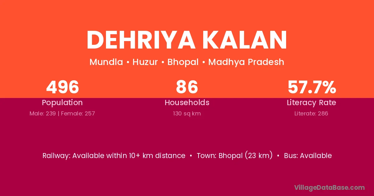 Bhopal (23 km) is the nearest town to Dehriya Kalan village for major economic activities and is located approximately 23 km away.