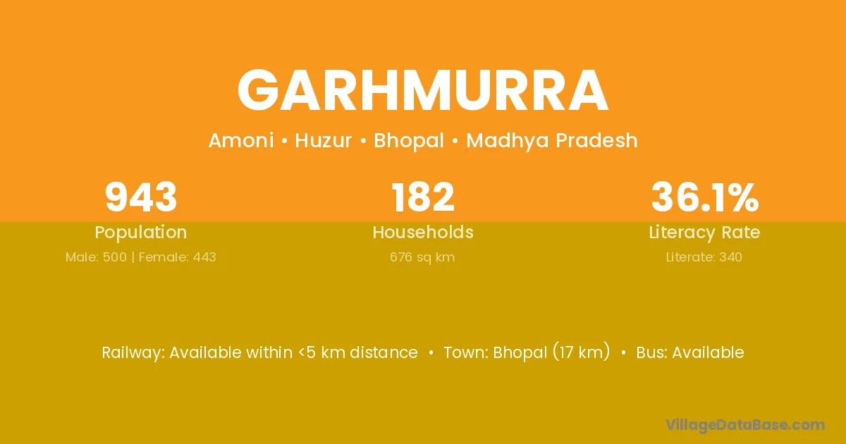 Bhopal (17 km) is the nearest town to Garhmurra village for major economic activities and is located approximately 17 km away.
