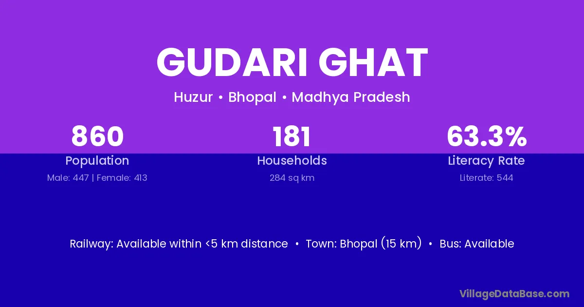 Bhopal (15 km) is the nearest town to Gudari Ghat village for major economic activities and is located approximately 15 km away.