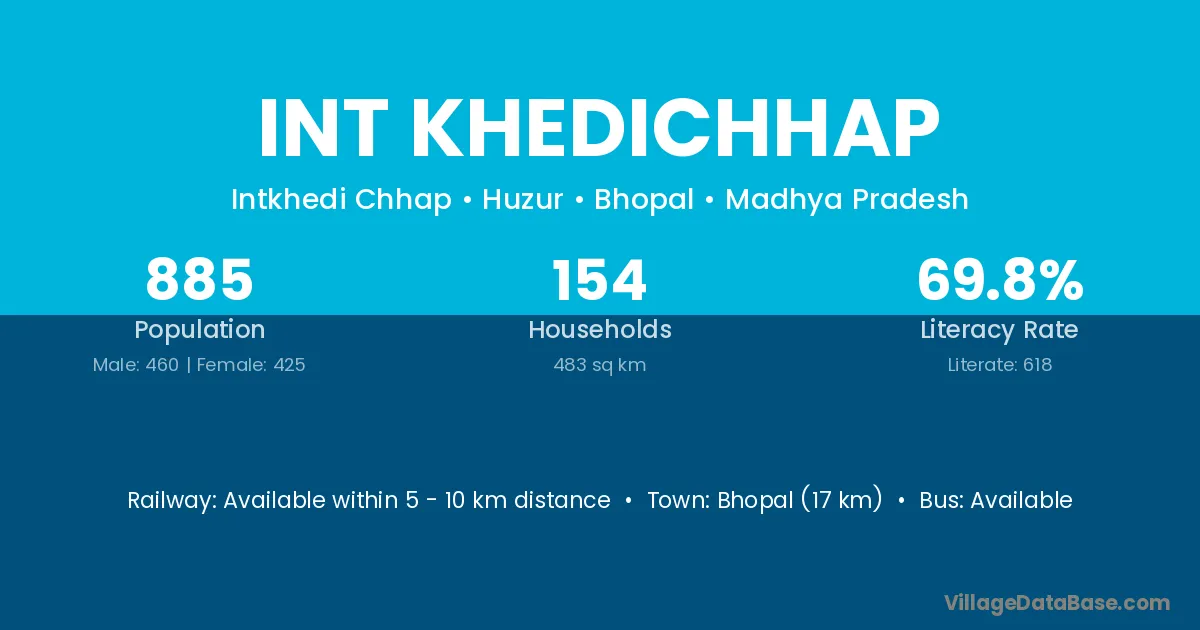 Bhopal (17 km) is the nearest town to Int Khedichhap village for major economic activities and is located approximately 17 km away.
