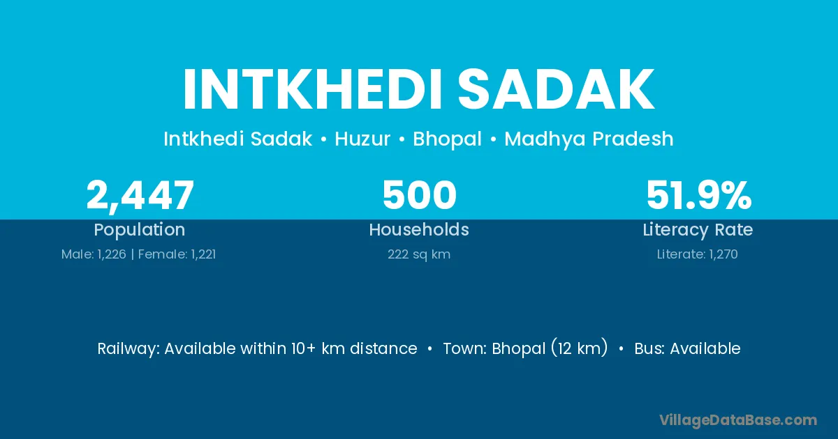 Intkhedi Sadak village has a total population of 2,447 people, of which 1,226 are males and 1,221 are females.