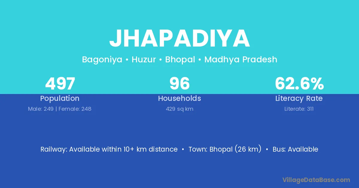 Bhopal (26 km) is the nearest town to Jhapadiya village for major economic activities and is located approximately 26 km away.