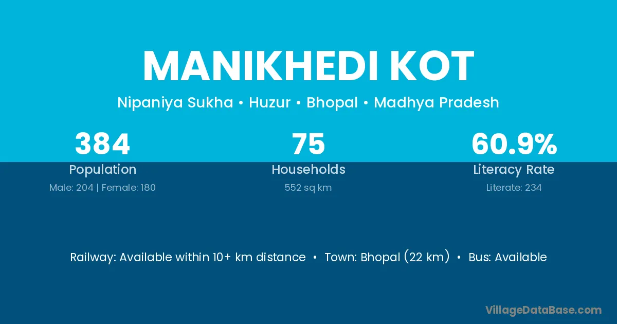 Manikhedi Kot village has a total population of 384 people, of which 204 are males and 180 are females.