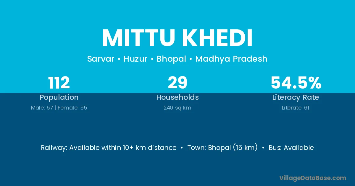 Bhopal (15 km) is the nearest town to Mittu Khedi village for major economic activities and is located approximately 15 km away.