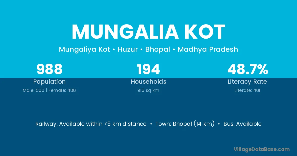 Bhopal (14 km) is the nearest town to Mungalia Kot village for major economic activities and is located approximately 14 km away.
