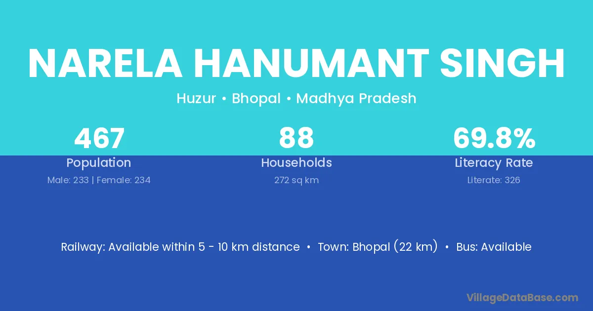 Bhopal (22 km) is the nearest town to Narela Hanumant Singh village for major economic activities and is located approximately 22 km away.