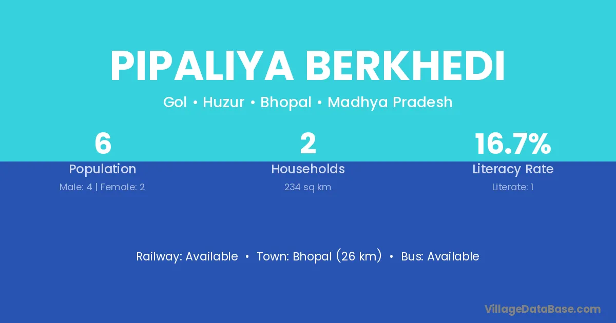 Bhopal (26 km) is the nearest town to Pipaliya Berkhedi village for major economic activities and is located approximately 26 km away.
