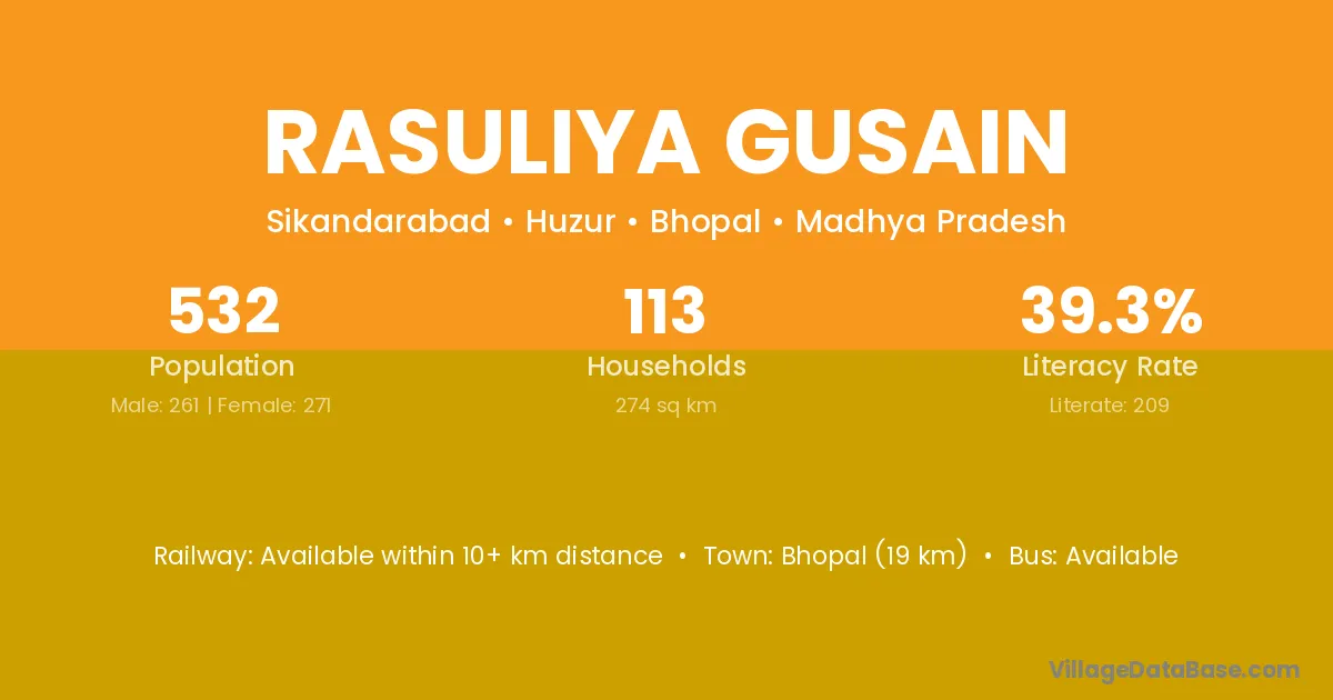 Bhopal (19 km) is the nearest town to Rasuliya Gusain village for major economic activities and is located approximately 19 km away.