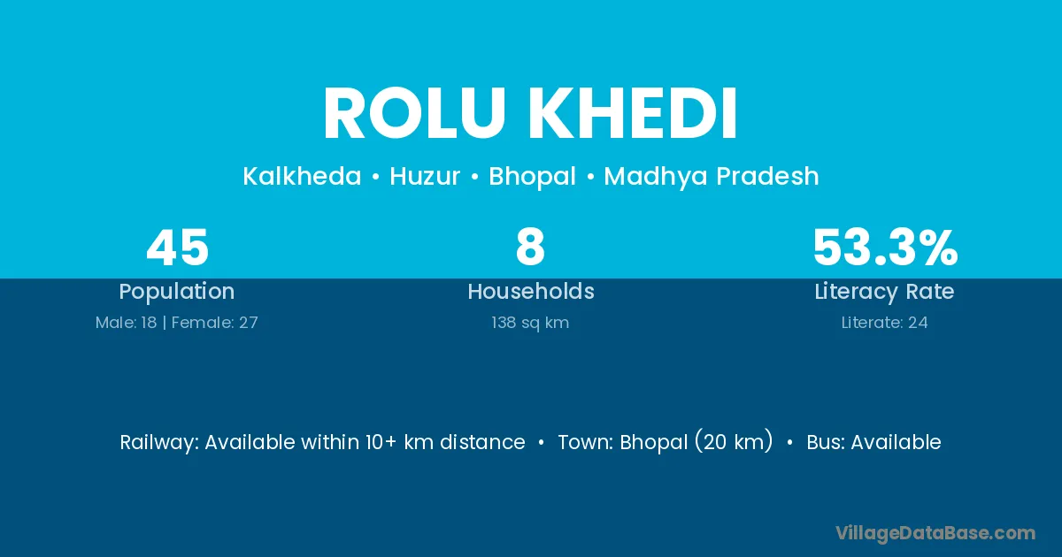 Bhopal (20 km) is the nearest town to Rolu Khedi village for major economic activities and is located approximately 20 km away.