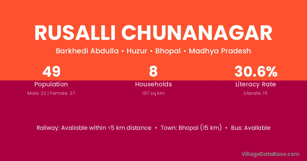 Bhopal (15 km) is the nearest town to Rusalli Chunanagar village for major economic activities and is located approximately 15 km away.