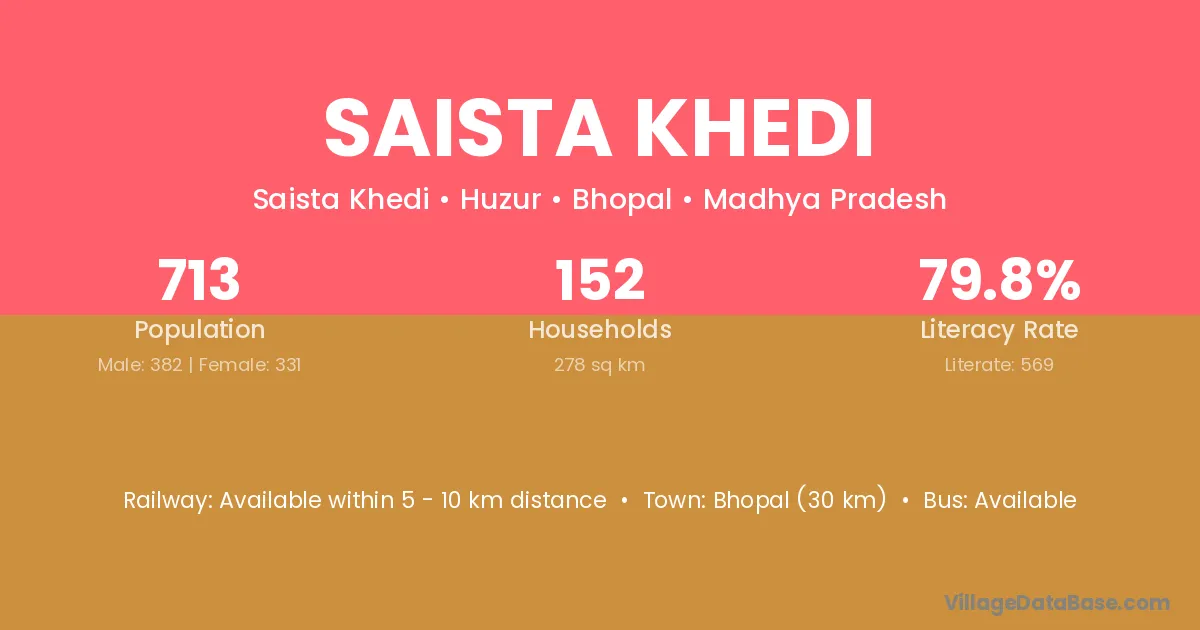 Bhopal (30 km) is the nearest town to Saista Khedi village for major economic activities and is located approximately 30 km away.