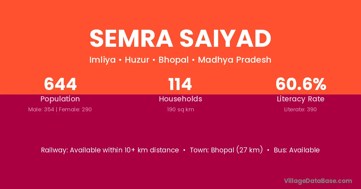 Bhopal (27 km) is the nearest town to Semra Saiyad village for major economic activities and is located approximately 27 km away.