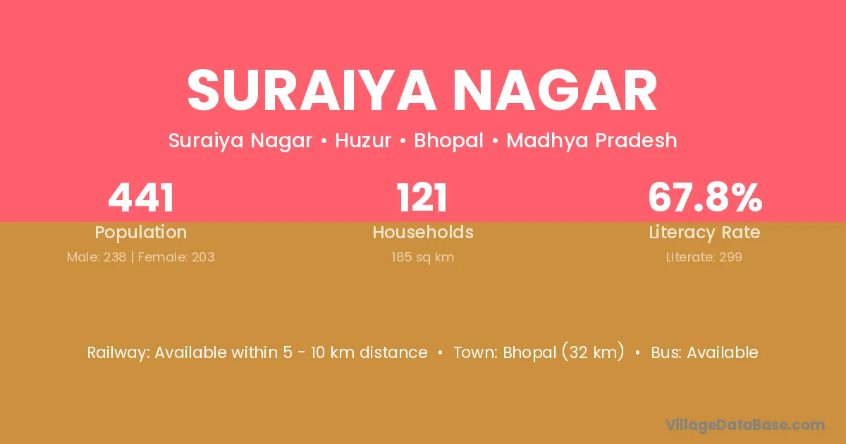 Bhopal (32 km) is the nearest town to Suraiya Nagar village for major economic activities and is located approximately 32 km away.